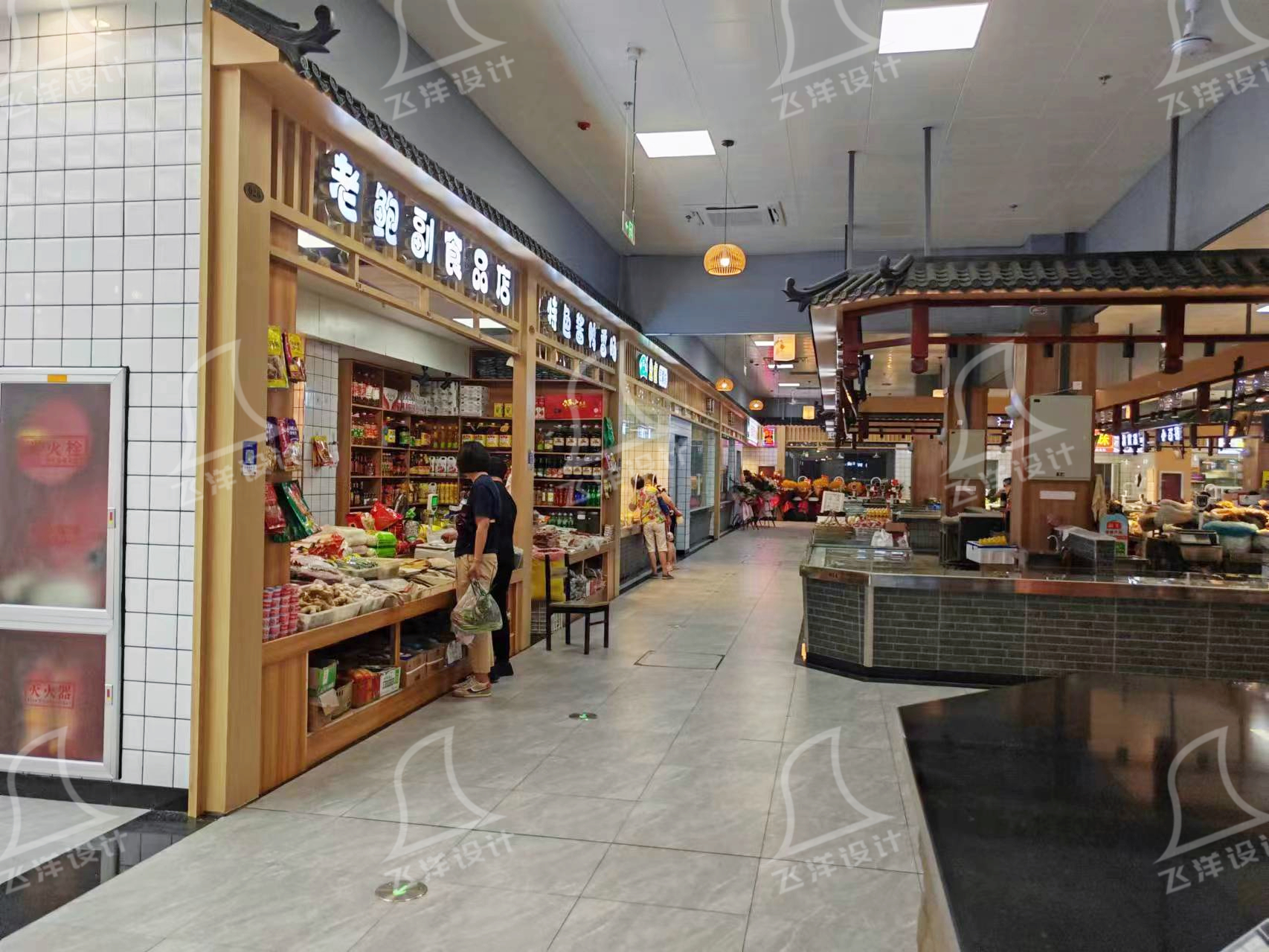 打破機械網(wǎng)格劃分,采用「主街 + 支巷」層級結(jié)構(gòu):4-6 米主通道保障通行效率,2.5-3 米次級巷道通過青磚鋪地、木質(zhì)廊架等元素,形成「一步一景」的探索動線。功能分區(qū)摒棄標(biāo)簽化標(biāo)識,通過頂部造型(鮮肉區(qū)金屬格柵、干貨區(qū)實木橫梁)自然過渡,讓顧客在迂回穿行中感受「逛中尋物」的傳統(tǒng)趣味,保留商販與顧客的高頻互動可能。?