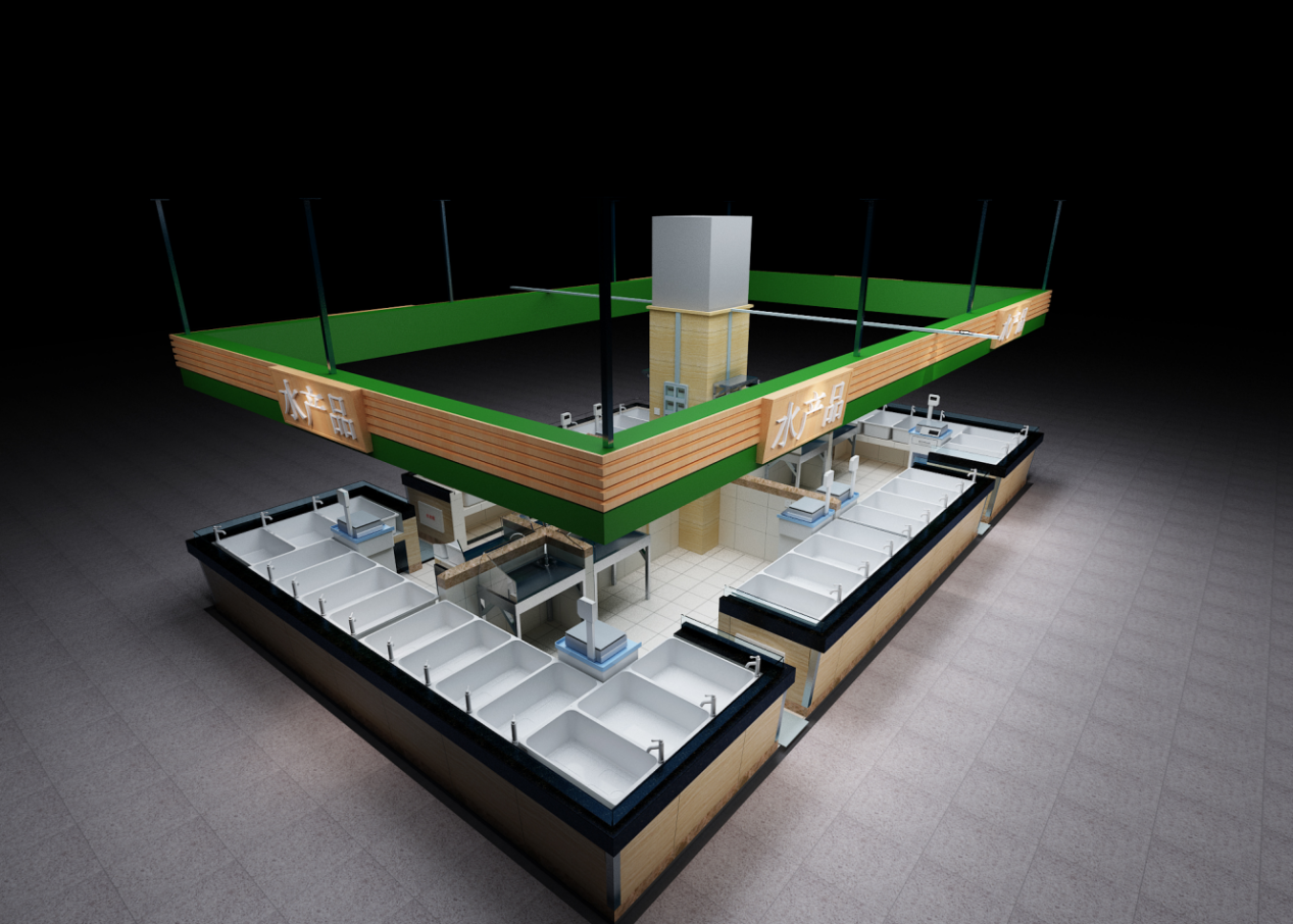 冰鮮水產(chǎn)品交易區(qū)柜臺宜設(shè)置在靠墻側(cè),布局相對集中。內(nèi)墻面鋪設(shè)瓷磚宜到頂,地面鋪設(shè)防滑地磚,應(yīng)有一定的排水坡度。臺面采用不銹鋼結(jié)構(gòu)或磚砼結(jié)構(gòu),臺面上加裝多孔不銹鋼板,外貼瓷磚。冰鮮經(jīng)營攤位還應(yīng)配置保鮮冷柜。