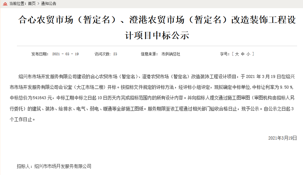 2021年3月19日上午9點30分許,杭州佰映中標合心農(nóng)貿(mào)市場(暫定名)、澄港農(nóng)貿(mào)市場(暫定名)改造裝飾工程設計項目。